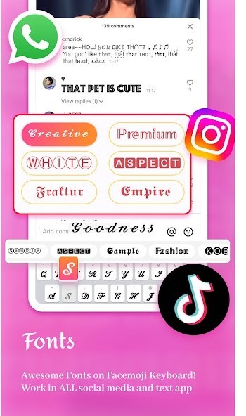 The best Font Keyboard app to make your Instagram bios & stories more attractive, get more likes for TikTok posts, write stylish Facebook posts, decorate your WhatsApp & LINE profile, and write fancy texts in Snapchat with awesome fonts and cute text faces.