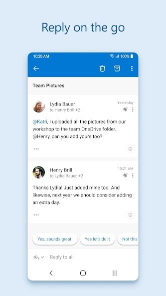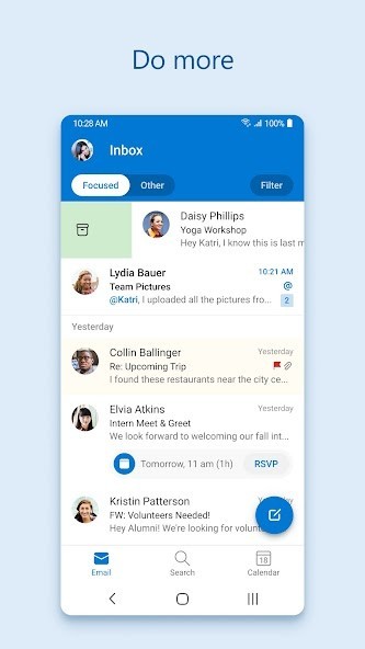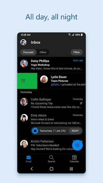Stay on top of your day through a secure email and calendar app that lets you manage your emails, files and calendar all in one place. Stay productive with whatever hits your inbox, whether it's from your work, school or your personal account. Organize your email intelligently, filtered into Focused and Other so you can easily see your most important messages. Keep your day organized by seeing multiple calendars at a glance.Outlook is free for personal use. You can connect your various accounts, like Microsoft Exchange, Microsoft 365, Outlook.com, Gmail, Yahoo Mail, iCloud and IMAP, giving you flexibility to stay connected on the go. Write polished, professional-quality emails with built-in intelligent editing tools for real-time typing suggestions, grammar, and spelling help. Send documents, photos, or video from your Files list, OneDrive, or your Gallery. Open Word, Excel, and PowerPoint documents right from your inbox.
