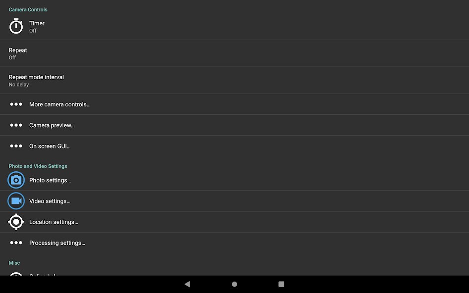 * Support for Camera2 API: manual controls (with optional focus assist); burst mode; RAW (DNG) files; camera vendor extensions; slow motion video; log profile video.