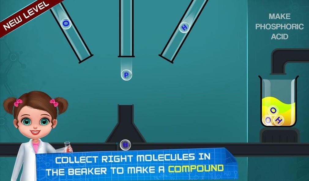 Move beaker left or right with taps and collect the right molecule to make the right compound. One wrong molecule will make the level fail. So how many molecules can you make without fail?